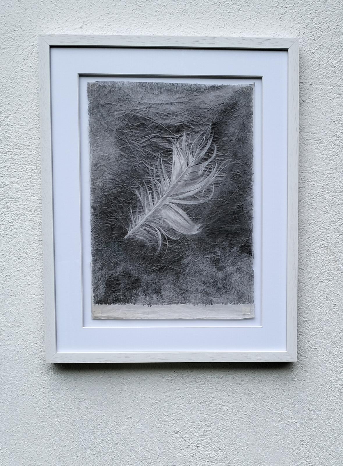 A random feather, spoke to me, my choice of pencil and tissue paper conveys the extraordinary strength and design of the feather while capturing its ephemeral and almost lighter than air nature