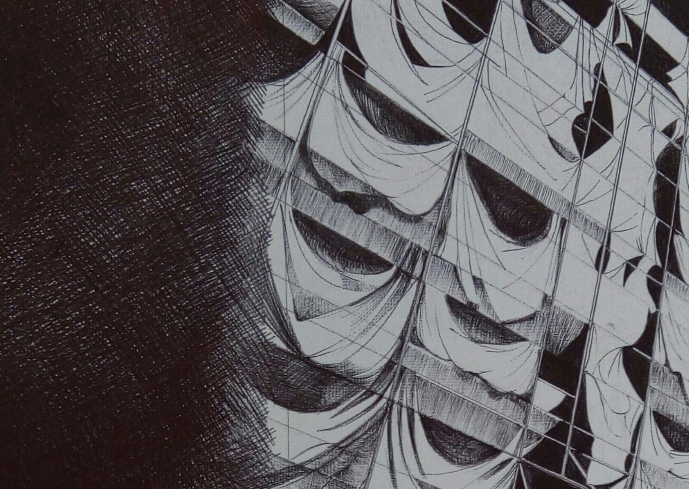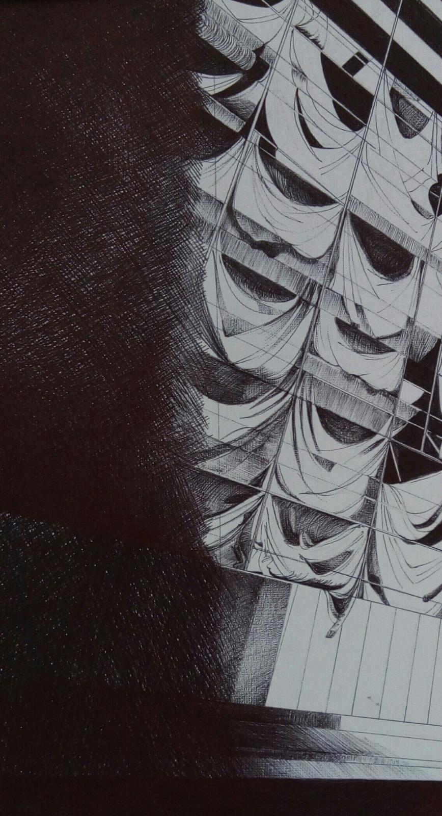 Part of a series of biro on archival paper studies, this observation from our contemporary world appreciates a certain beauty while questioning the misuse of our environment