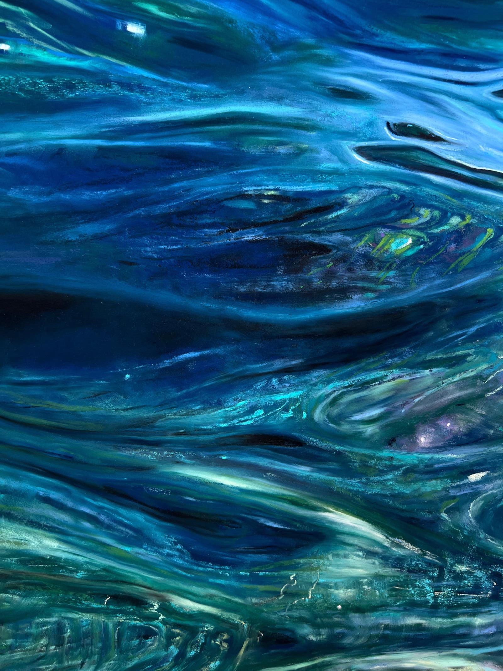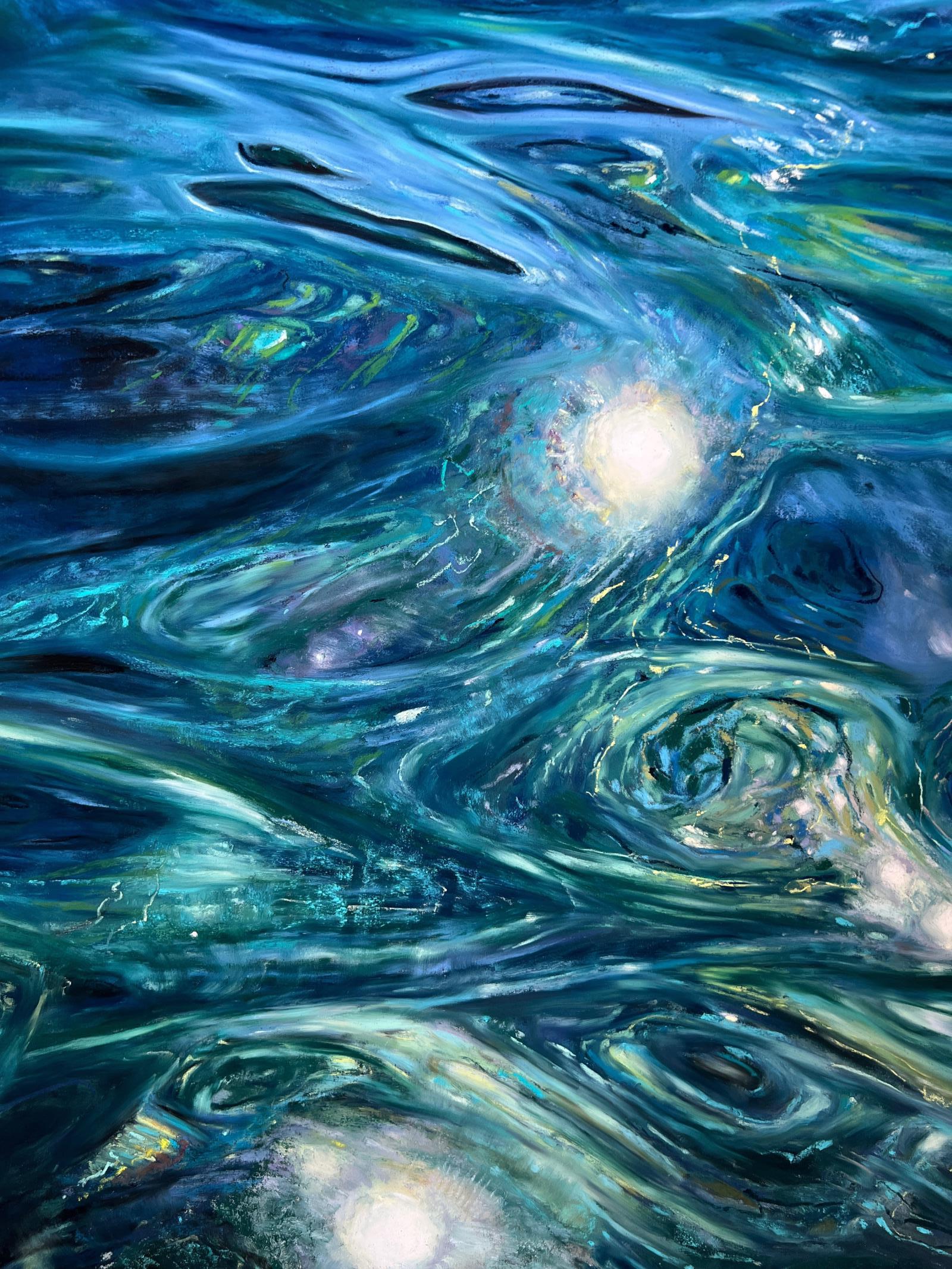 This is my newest piece from the “Meditations” series that I have been working on and off since 2018. These works are meditations on time as a substance that continuously moves with and around us in the here and now, opposite to the linear perception of time typical for the West European culture. The circular perception of time comes from my growing up in Asia. Through “Meditations”, I see time as a space, as an infinite labyrinth with ever-changing walls and crossing paths, an image I find truly fascinating. The intricate pattern of sea waters pulls me in but also gives me an impulse to stop and reflect. It is enchanting, almost bewitching. Waters become a symbol of human minds, multilayered, ever-changing. Like sea waters, they have their depths, unreachable and intriguing. This piece was done in combination of dry and wet-on-wet pastel techniques.