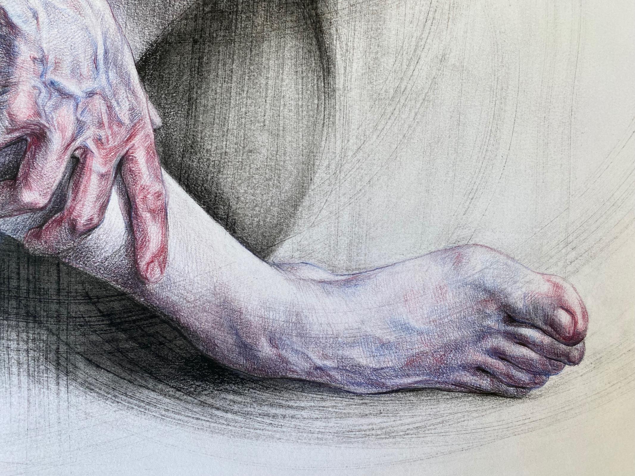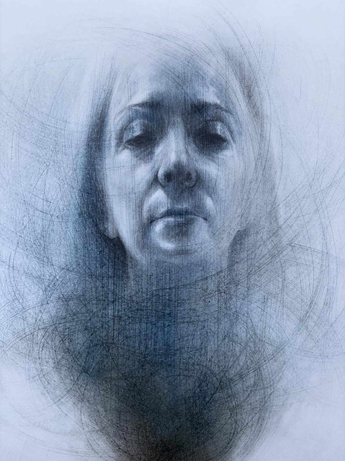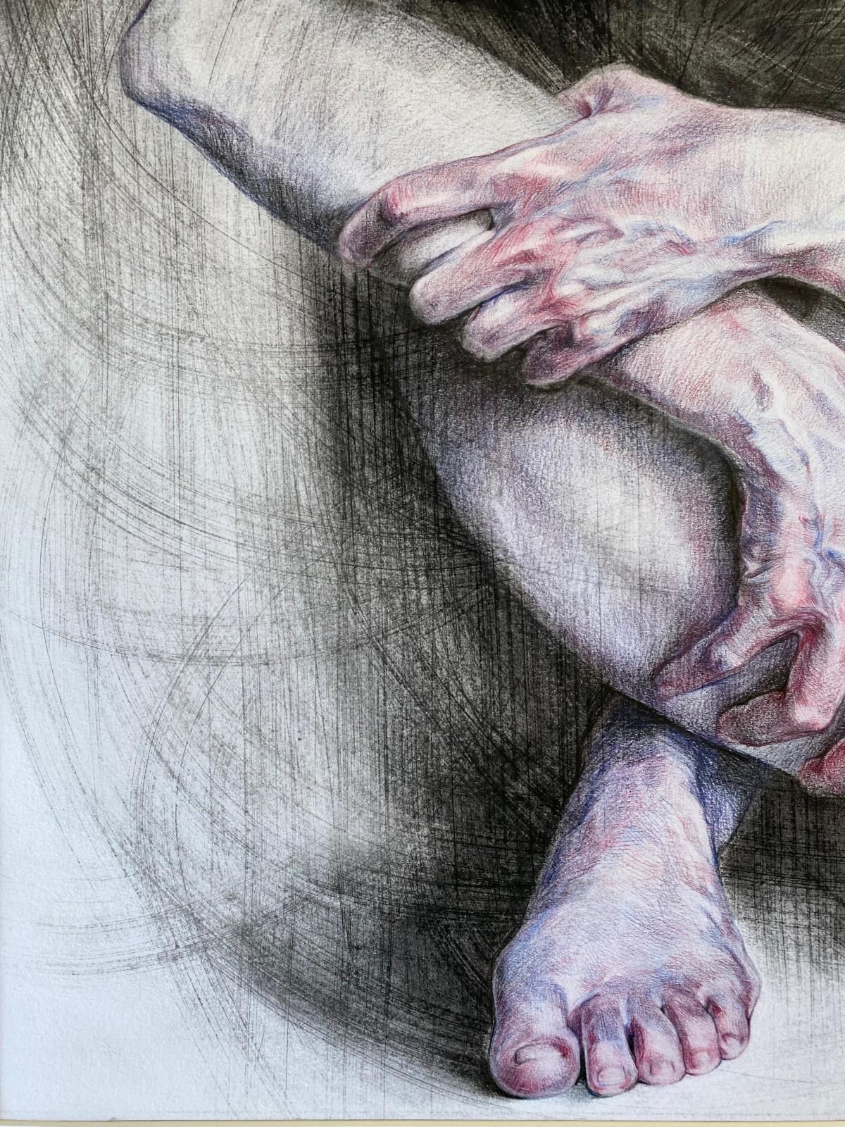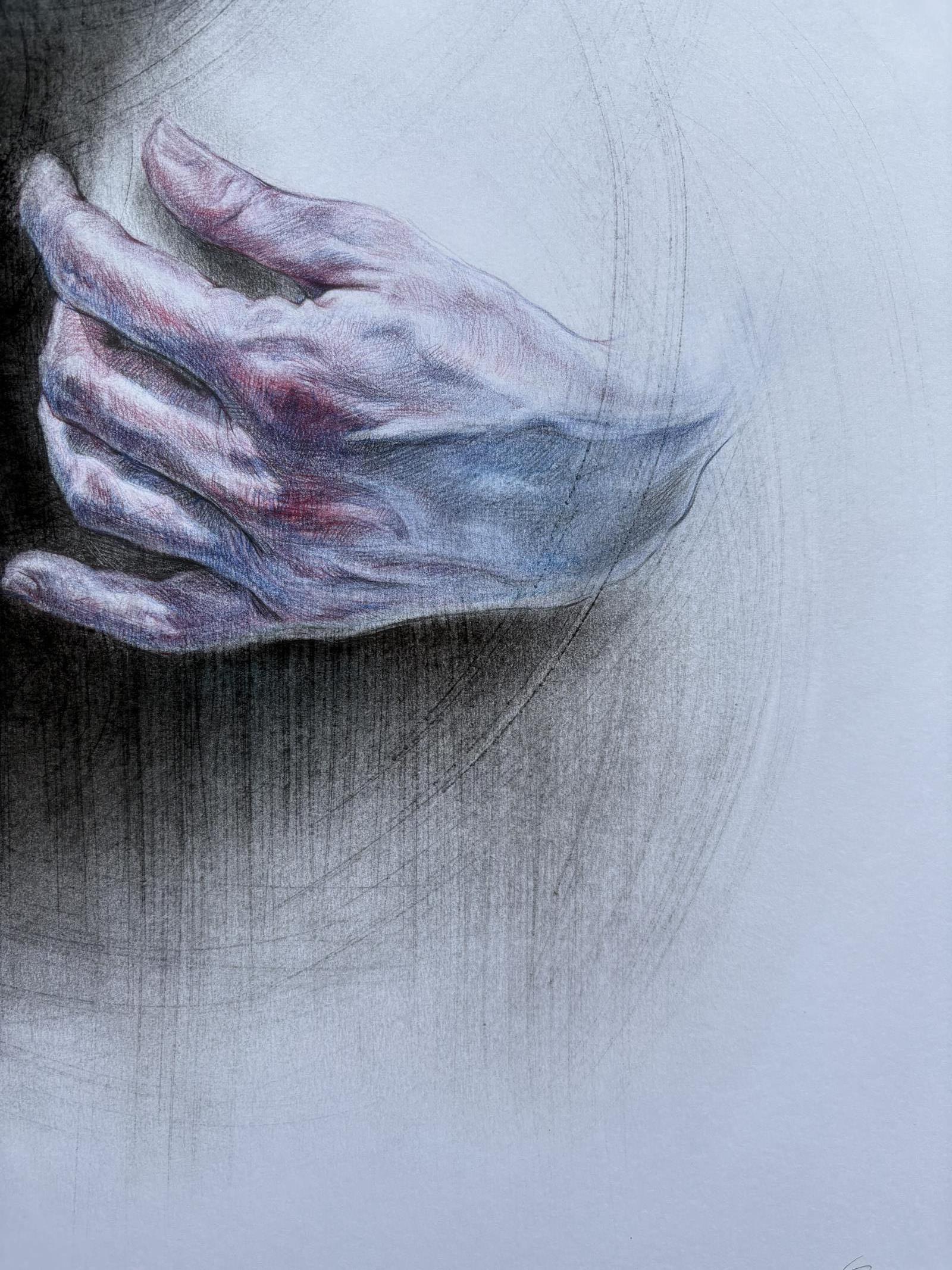 The sitter is depicted holding herself together in a sort of hug, seeking comfort and safety while trying not to be swallowed up by her inner void. The decontextualisation and the decision to portray her naked help highlight her vulnerability. Only a few details are in focus, while everything else dissolves into blur. The artist likes to give the viewer the illusion that the sitter is either emerging from or disappearing into a vortex of lines, which also contribute to giving movement to the composition, while making the surface uneven and richly textured. These marks are created by sanding the paper, following the dynamism the artist wants to achieve in the picture.