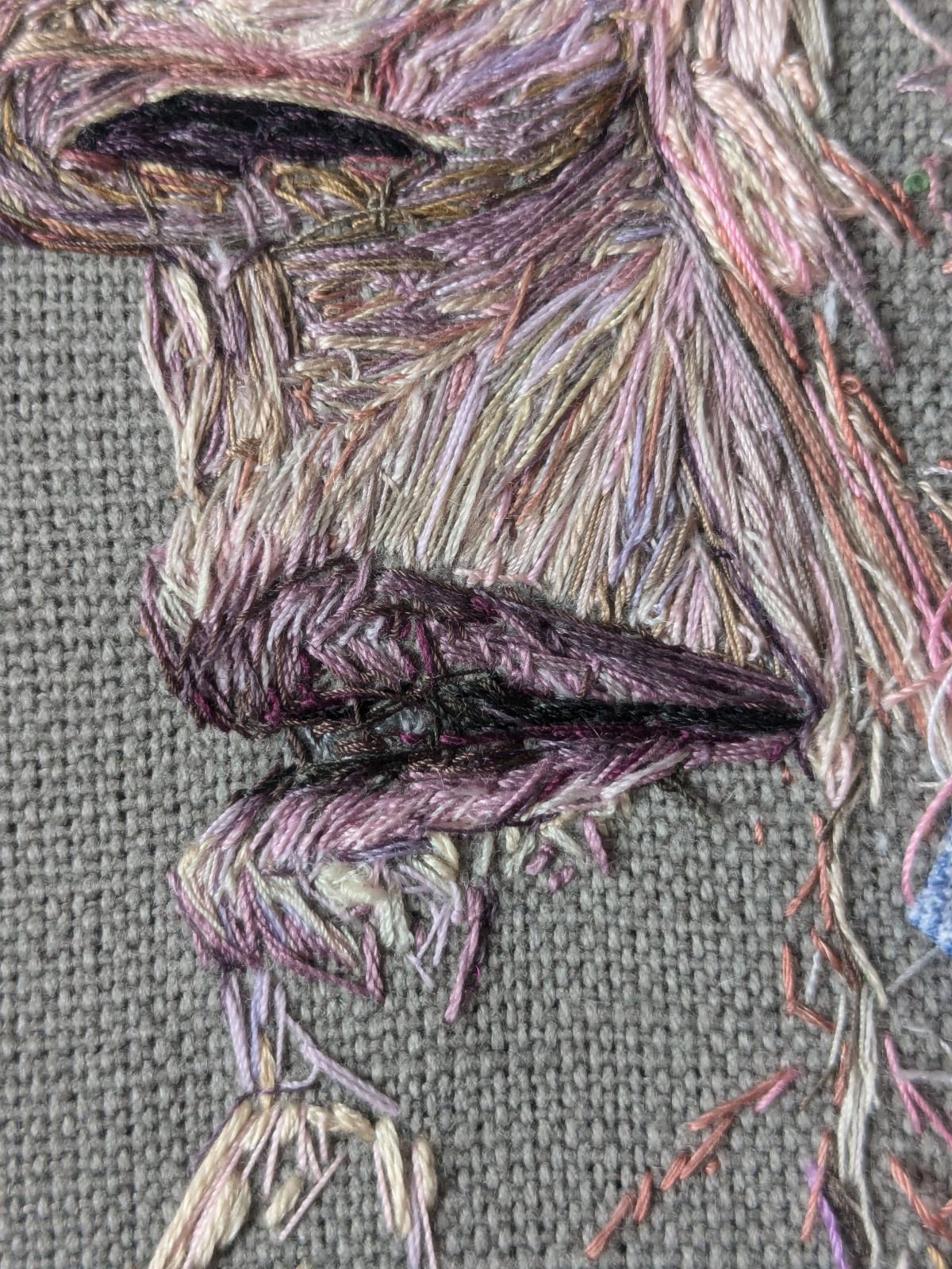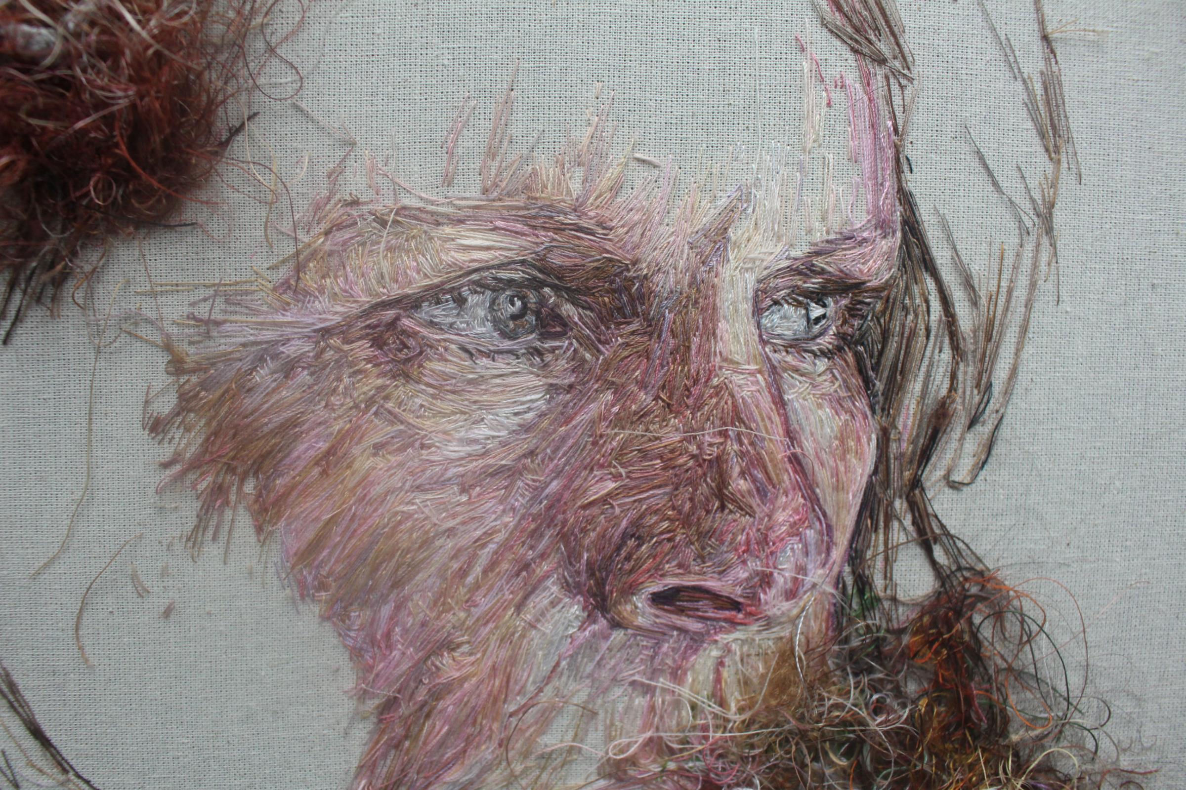 a female portrait amongst smaller collaged pieces of pink fabrics with thread tangle clusters