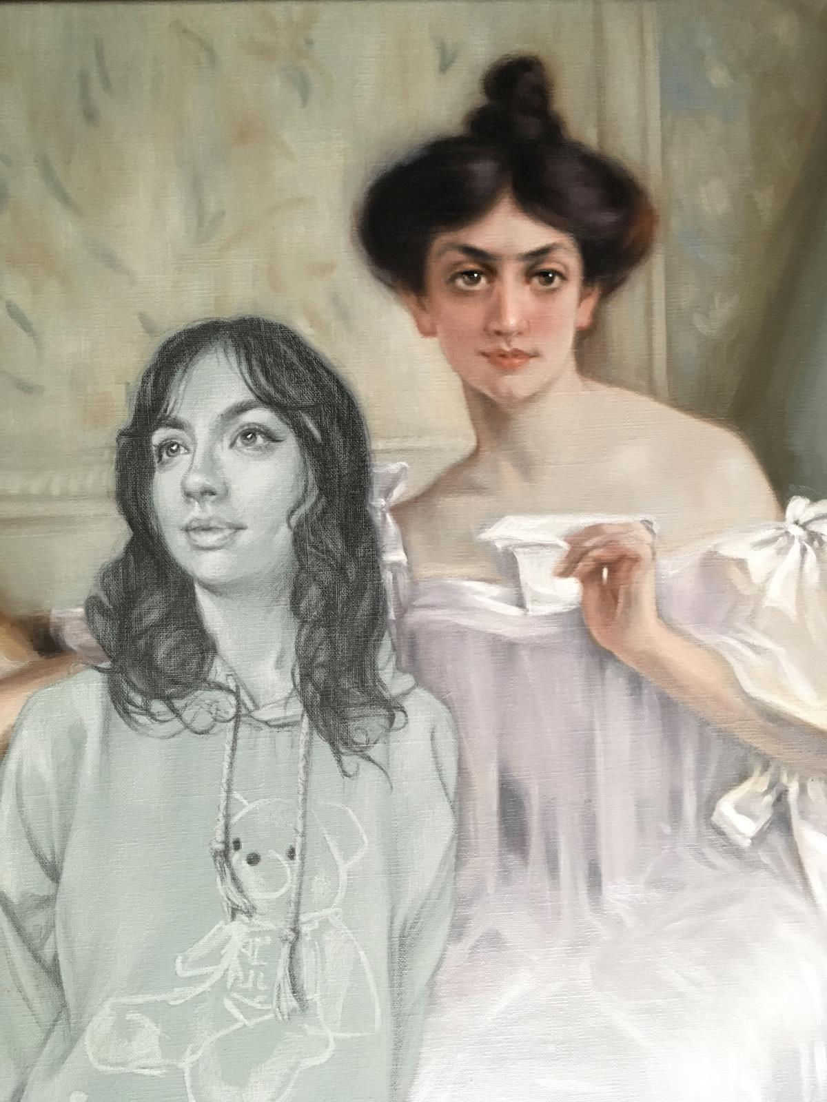This artwork is inspired by sketches made of a painting in a local art museum “Portrait of a young girl” by Thérèse Duchâteau, 1897. The additional modern day young lady posed in my studio and has been drawn in pencil with white Conté crayon highlights. This artwork is inspired by the 19th century artwork and has been interpreted to tell a different story. The viewer of this artwork can only imagine what is written in the letter.