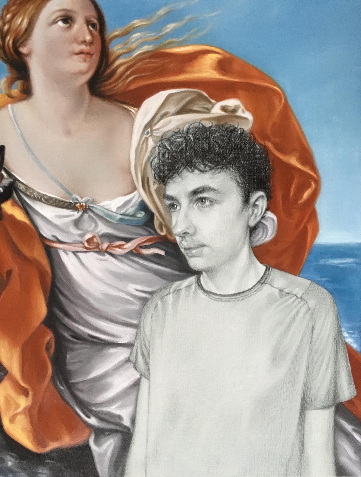 This artwork is inspired by sketches made of a painting in a local art museum “The abduction of Princess Europe”. This painting has been taken from a larger painting of the Greek myth, “Metamorphoses d’Ovide”, by Guido Reni and a collaborator. My modern day collaborator in this scene posed in the studio and has in drawn in pencil and white Conté crayon. The myth tells a story about transformation, love, anger and punishment and my added character is simply a viewer caught up in the scene.