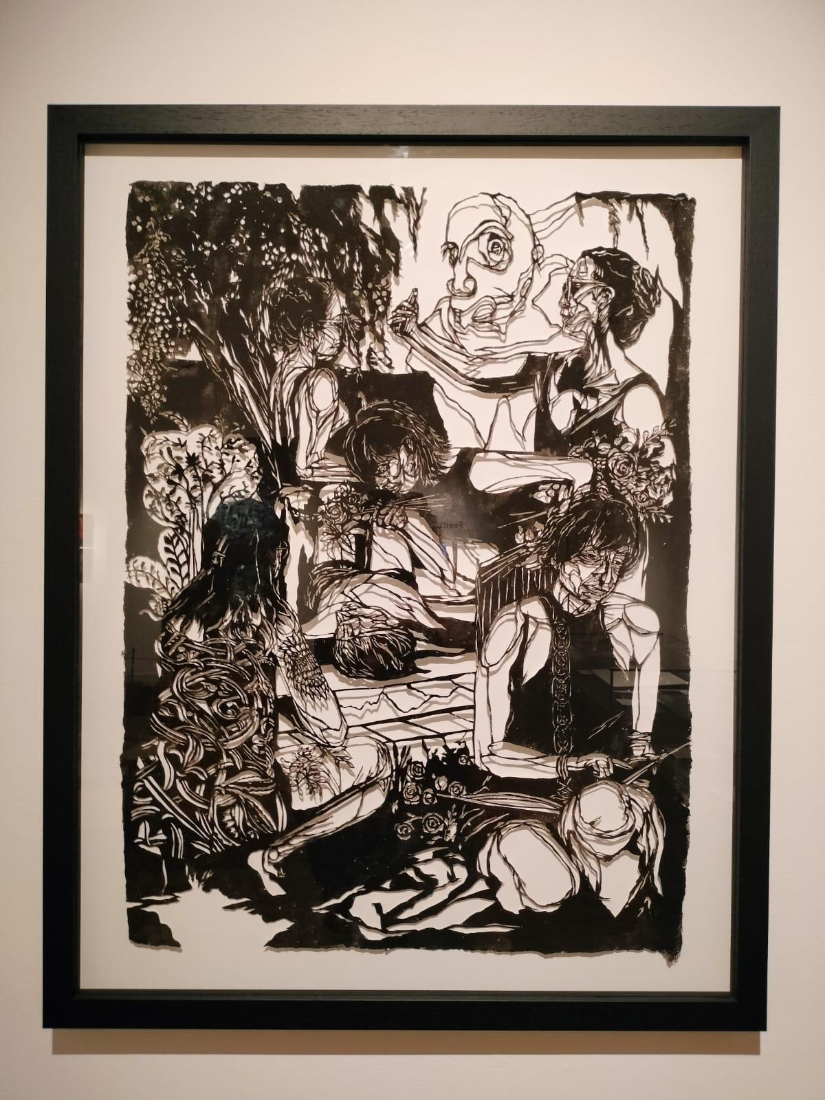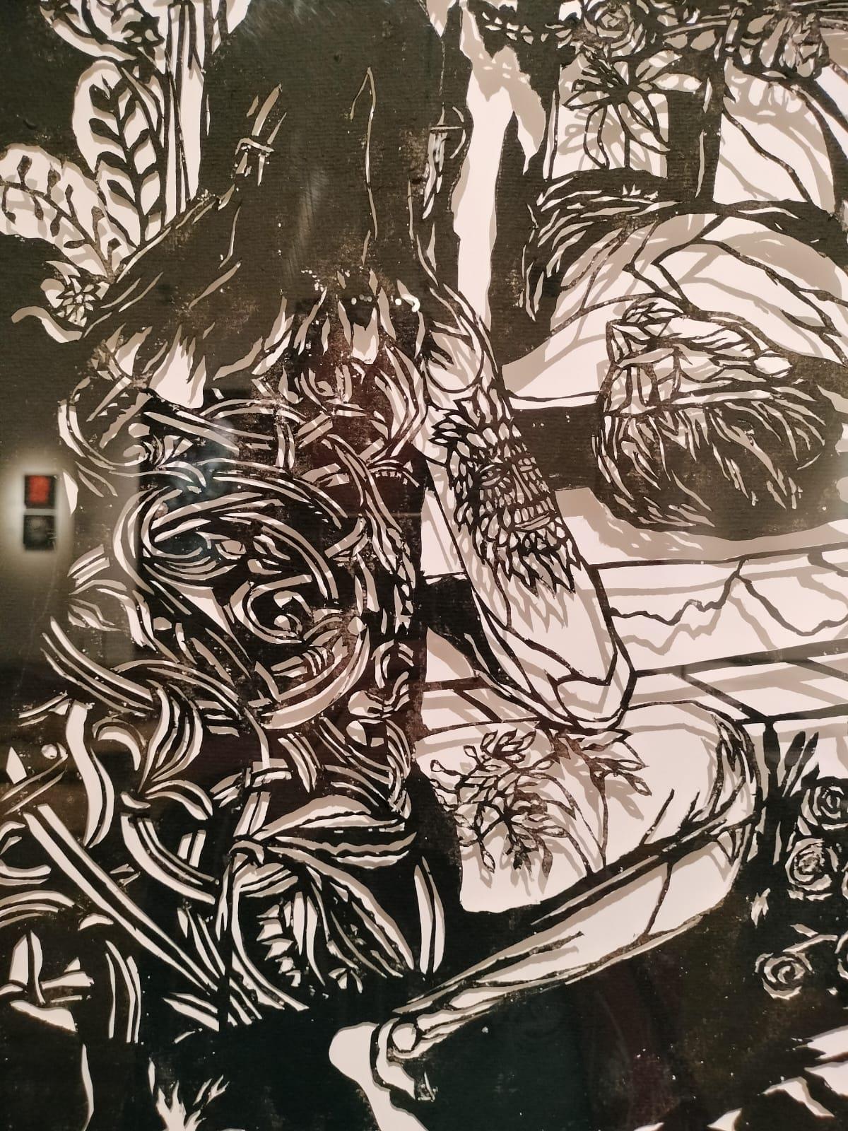 'The Garden and the Gate is a freehand papercut, drawn with a scalpel. The piece is constructed from a collage of drawings, but these were used for reference in the cutting process rather than to trace through. The improvised mark making is important in giving the artwork an energy and spontaneous feeling. The artwork explores the positive impact that immigration has had on the development of English culture and identity. The initial starting point was the myth of giants arriving in the land of Albion and physically shaping the environment and creating an initial identity for the land. The image of a green and pleasant garden and the fairy tale setting provide the opportunity to explore and reflect on the tensions around national identity and power dynamics. The complexity and intricacy within the image explore the interwoven and dense structure of a diverse and ancient society.