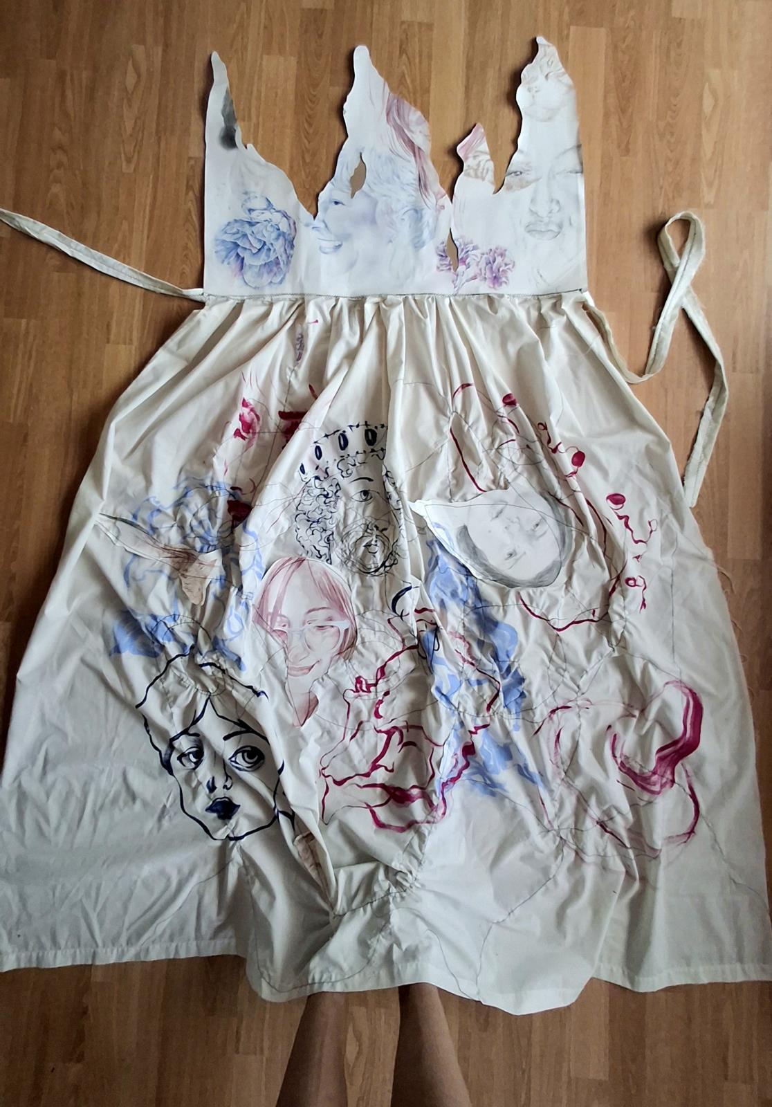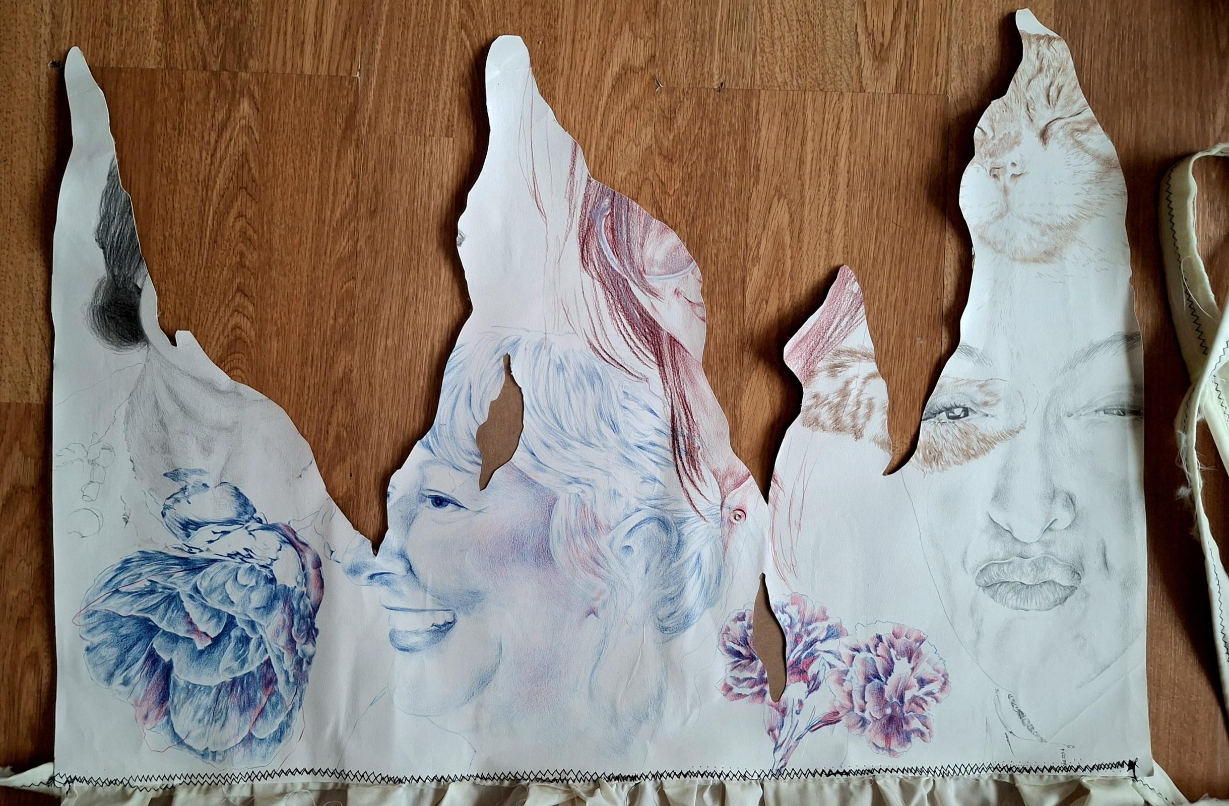 Graphite, pencils, acrylic, embroidery on paper and cotton