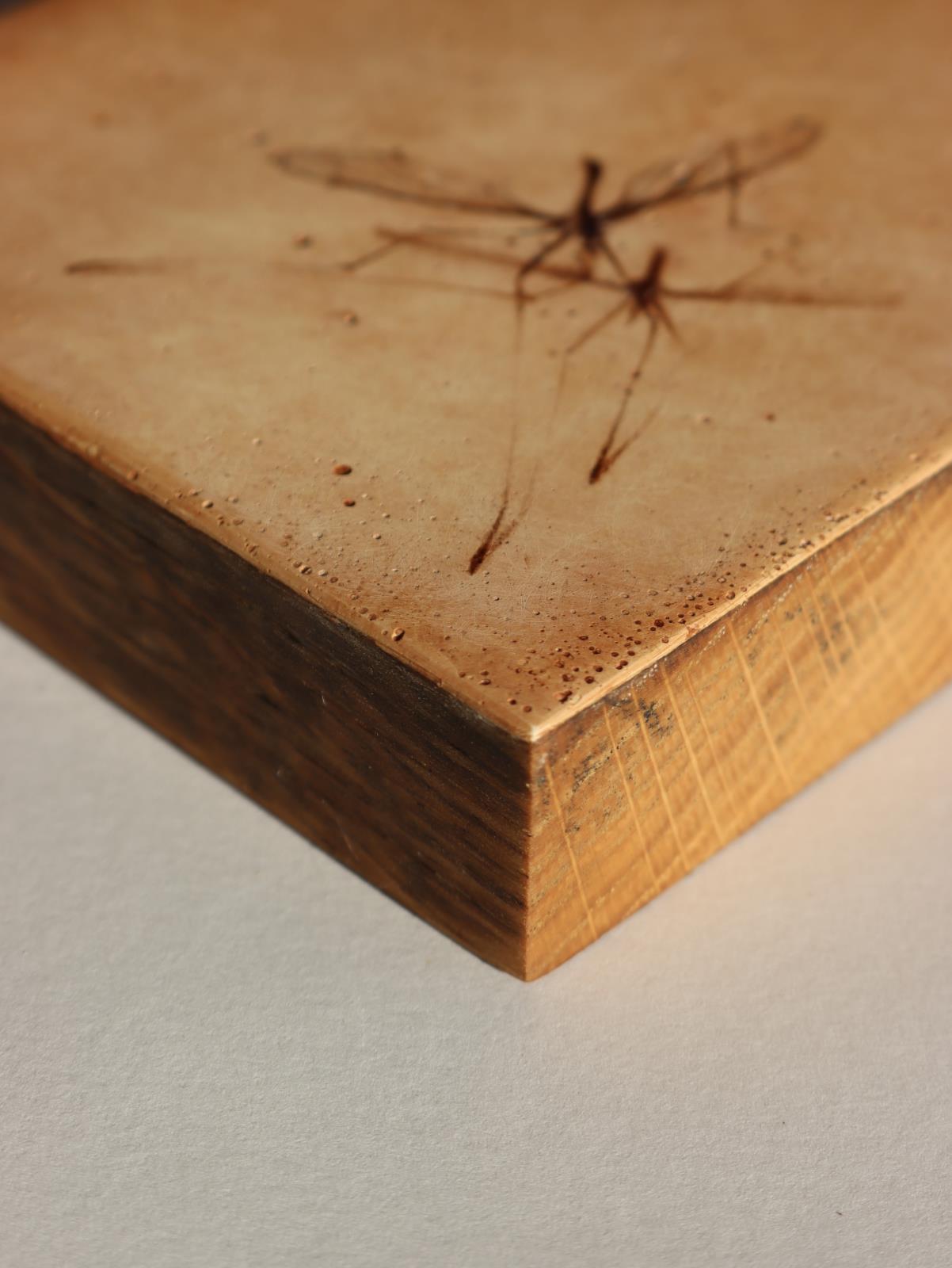 Bone black pigment (fox, crow, roe deer) with site specific earth and charcoal in linseed oil on gesso and reclaimed oak