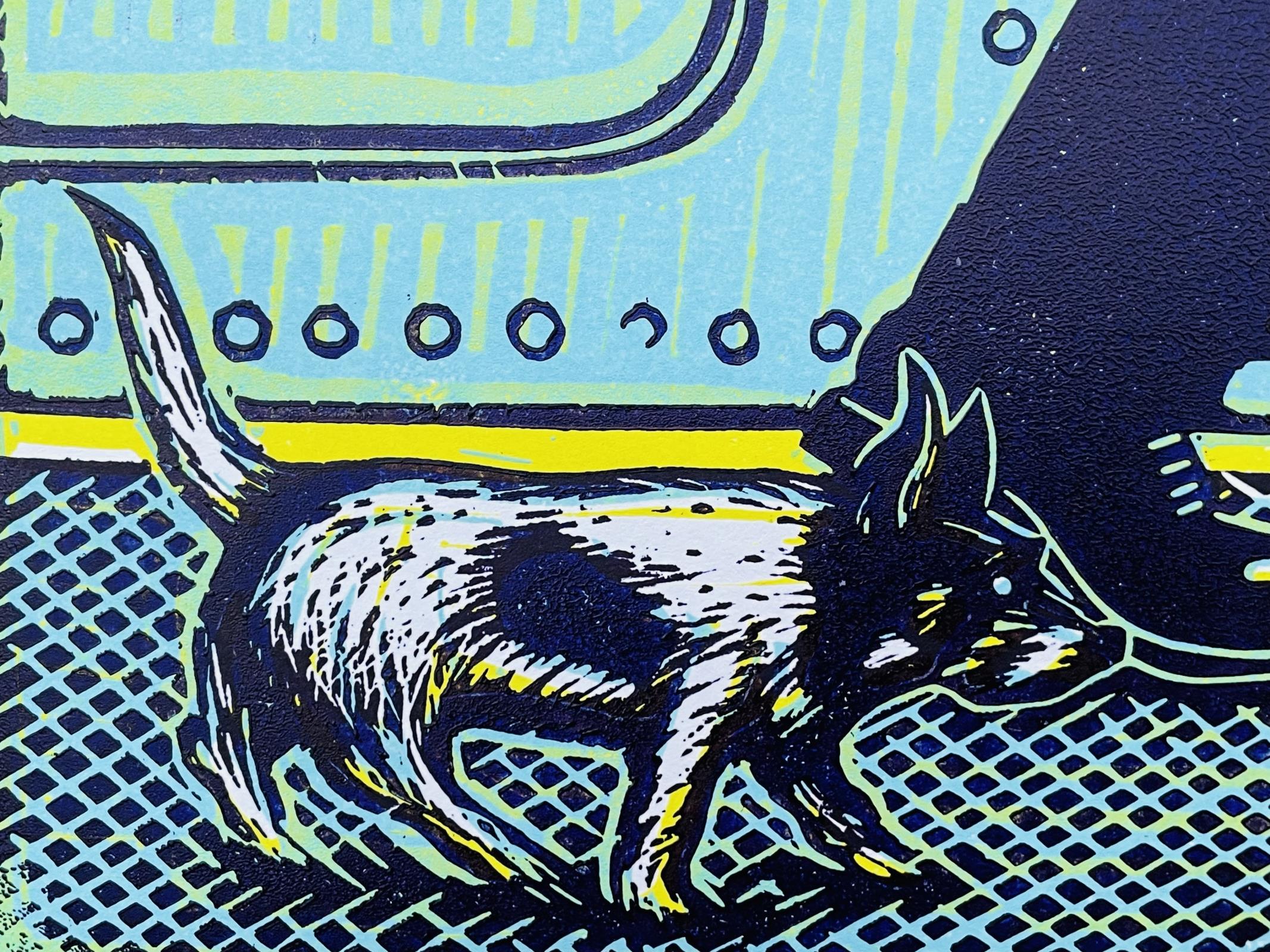 Handmade Linocut Print of Commander and Terrier. Step into a story of loyalty, wit, and companionship with “Quick March.” This limited edition linocut print captures a proud Commander pacing the battleship deck, his faithful terrier Quick trotting close behind. A joyful celebration of friendship, storytelling, and the timeless bond between people and their dogs, it’s more than just a print - it’s a characterful scene alive with humour and heart. Don’t be fooled by Quick’s name - he only lives up to it when there’s a football in sight, racing faster than a cannonball!