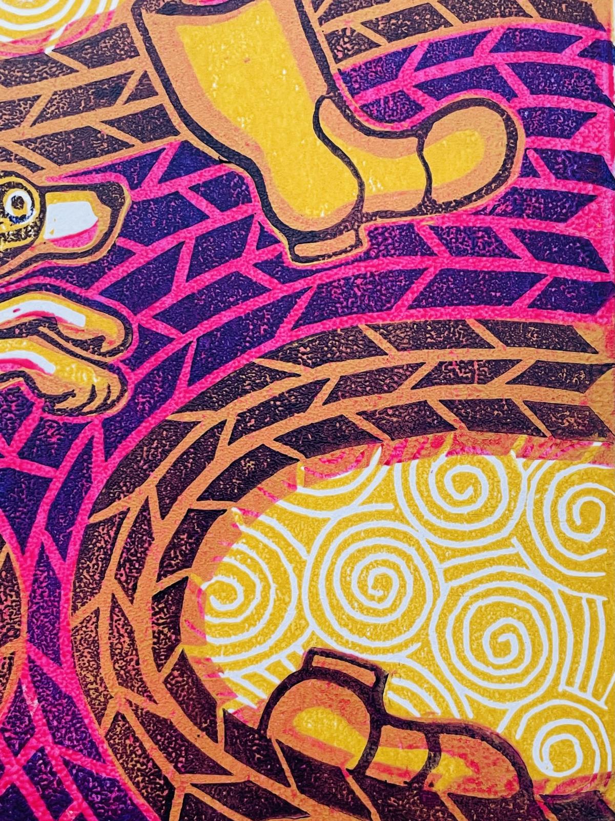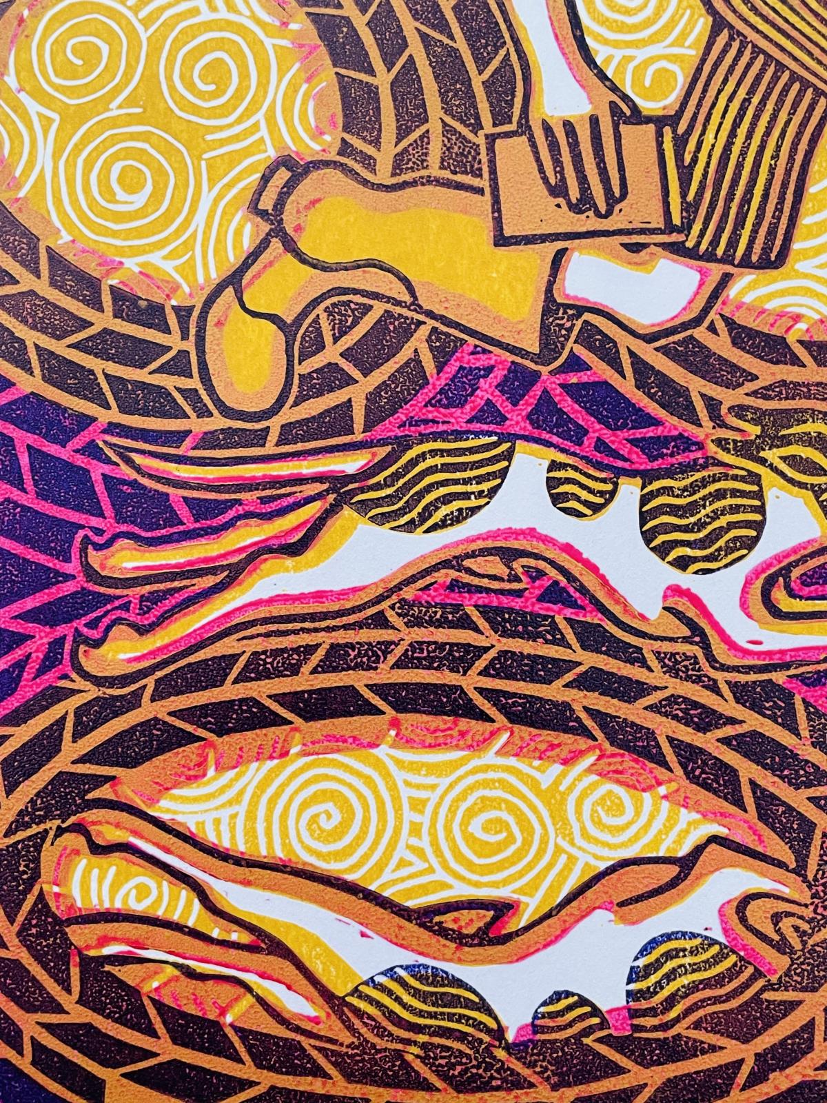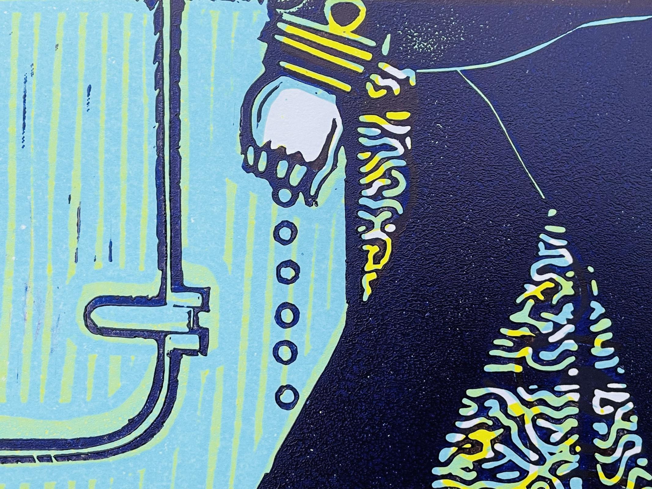 This one-of-a-kind handmade linocut artist proof captures a tender moment of childhood imagination and adventure. A child in oversized wellington boots, clutching their favourite book, runs joyfully alongside a faithful dog as it leaps over puddles in a magical, dreamlike landscape. The scene evokes the freedom of outdoor play and the boundless worlds found in books - where stories spill out into real life, and every journey becomes an adventure. The expressive marks and textured surface of the linocut give the piece a timeless, nostalgic quality, celebrating curiosity, companionship, and the simple magic of being young. A whimsical detail invites the viewer to wonder: what story is the child carrying? Perhaps it’s a tale of daring quests, secret forests, or a faraway place - left open for your imagination to decide.