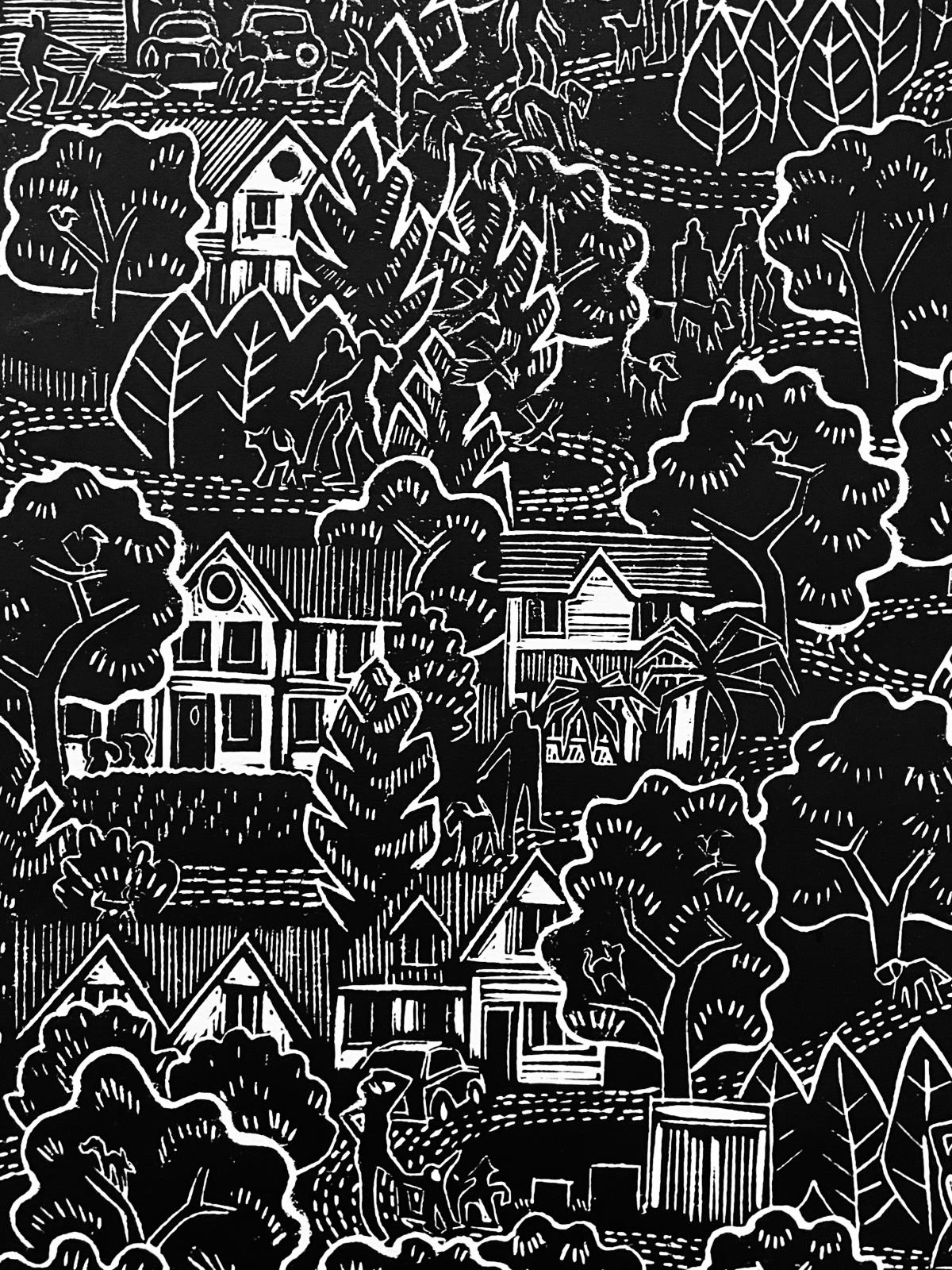 Dog Walkers is a finely detailed, limited edition linocut print that celebrates the quiet charm and gentle rhythms of forest walks shared with my dog. Hand-carved and printed using traditional relief printmaking techniques, the artwork is rendered in striking black and white, allowing texture, line, and contrast to evoke the atmosphere of nature and companionship. The composition is inspired by map-like drawings created from memory of my local suburban dog walks in Hampshire. Familiar pathways weave through a landscape of trees and neighbouring houses, blending observation with recollection. Rather than a literal depiction, the scene reflects how places are held in the mind - layered, personal, and shaped by repeated journeys. This print captures the calm intimacy of everyday moments outdoors, where routine walks become reflective experiences and shared paths tell quiet stories.